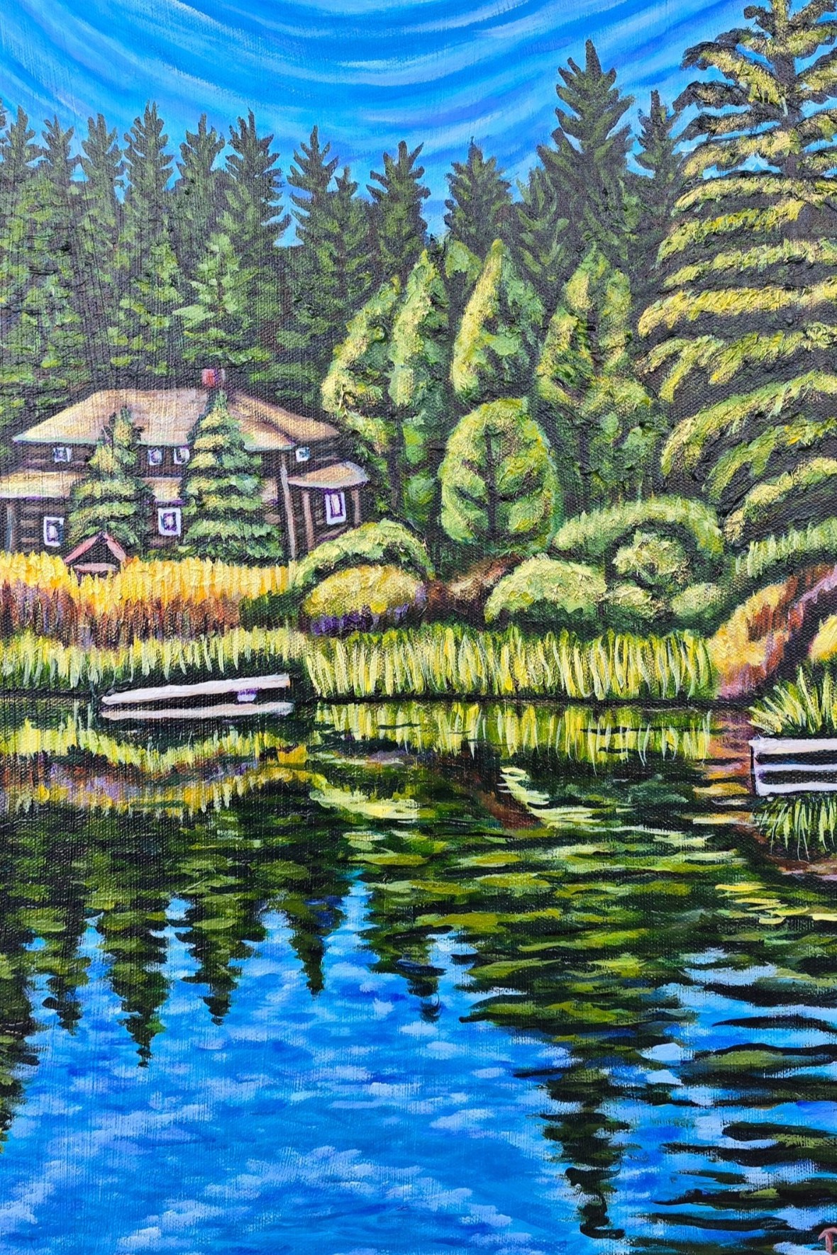 Acrylic on canvas 18×24 This painting is inspired by a small lake I came across on my travels up to Sun Peaks. I loved the reflection in the water and the log house in the forest.  I once lived in a log house in the forest for 25 years, though not by a lake. However, this scene reminded me of my time living in nature among the trees and wild life.
